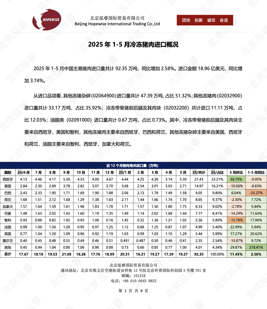 2025年1-5月冷凍豬牛禽肉海關進口數據