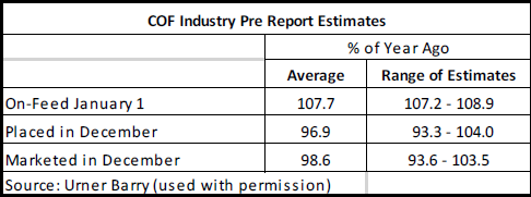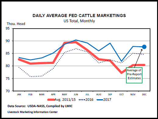 許多分析者預測12月份進入育肥場的育肥牛數量同比會下降。2016年12月的存欄量是自2010年以來量最大的月份, 最近幾個月的存欄量也一直很大。 然而,如果在報告中會有一個出乎預料的數據的話,應該是存欄量會高于報告前預測的平均水平(只有前一年的96.9%)如果12月的存欄量符合報告前預測的平均值,在2017年第四季度(10月-12月)進入育肥場的牛總數同比增幅7.5%(433,000頭),是2012年以來同期最大量。