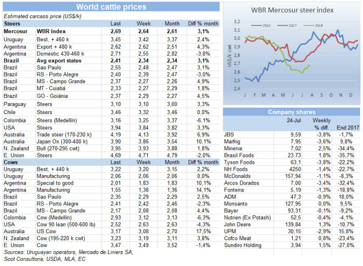 本周各國(guó)貨幣尤其是巴西雷亞爾增值,使閹牛價(jià)格上漲,南方共同市場(chǎng)閹牛指數(shù)上漲5美分到2.69美金。巴西雷亞爾對(duì)美金增值2.5%,部分原因是總統(tǒng)候選人Geraldo Alckmin受歡迎度很高,10月大選前景比較被看好,而且本地牛價(jià)也增加了0.3雷亞爾/公斤,綜合起來(lái)育肥牛價(jià)格漲了7美分到2.41美金,9周以來(lái)最高。烏拉圭閹牛價(jià)格由于供應(yīng)緊缺也漲了,阿根廷牛價(jià)穩(wěn)定,貨幣也穩(wěn)定,連續(xù)四周價(jià)格不變,巴拉圭由于處于口蹄疫接種時(shí)期,市場(chǎng)比較平靜,牛價(jià)保持不變。