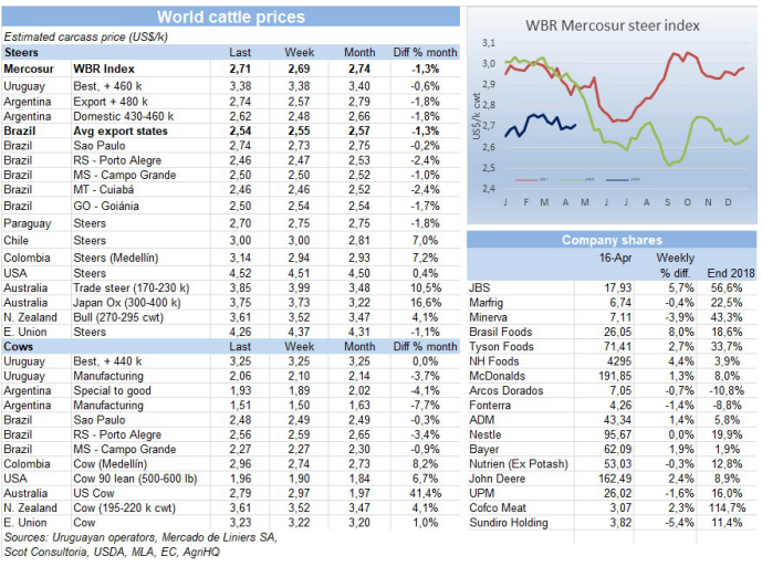 中國市場還很活躍,不過有些產品價格下調了50美金,非洲豬瘟的影響使肉類蛋白價格大漲。雖然烏拉圭屠宰量還保持在每周5萬頭以上,但工廠不愿意報太長的船期,因為不知道這樣的屠宰節奏能保持多久。另一個因素是Sial上海展會一個月后要開,今年是5月14-16日。目前巴西牛肉出口香港成交很緩慢,腱子價格不超過3300美金。