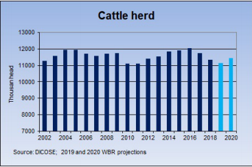 預計2018/19年活牛存欄將連續第三年減少,但2019/20年會開始逐漸恢復,今年6月30日存欄量將再度減少,受母牛支撐屠宰量很高,2018/19財年屠宰量會保持在230萬頭以上。雖然活牛出口會減少,但整體牛肉生產量會比受干旱影響小牛犢出生率低的2017/18財年更高,小牛犢存欄將在270萬頭上下。年中活牛存欄量將在1115-1120萬頭,同比減少15-18萬頭,比2016年少90萬頭。有幾個因素表明2020年存欄量會開始復蘇,一方面母牛受孕率比較樂觀,下個春季出生的牛犢(也就是2020年中開始進入市場)會達到290萬頭上下,比今年多20萬頭;另一方面出口的活牛以及賣給屠宰廠的活牛會減少,待宰牛比較少,尤其考慮到活牛出口受政治因素影響較大,今年出口土耳其的量不大可能達到去年的40萬頭,很可能會減半。因此由于牛犢增多,屠宰減少,出口活牛減少,牛只存欄會在2020年開始增長,大概會達到1140萬頭。