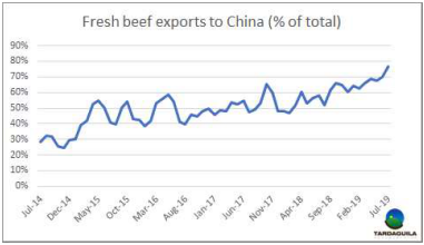 中食展期間的高需求量以及價格反映在了烏拉圭過去兩月的出口價格上,前四個月出口均價換算為胴體重量為3727美金/噸,而六七月均價達到4110美金,增長10%。另外中國市場進口量占牛肉產量比例增長,前四個月占比52%,而六七月是59%。
