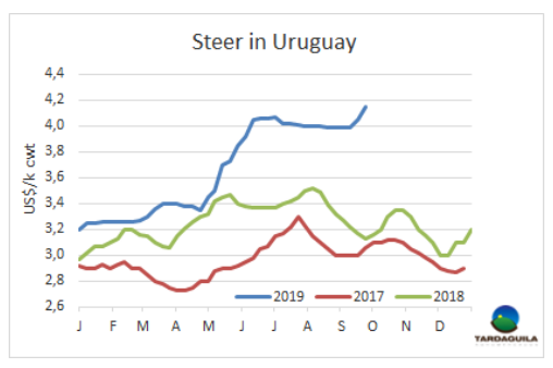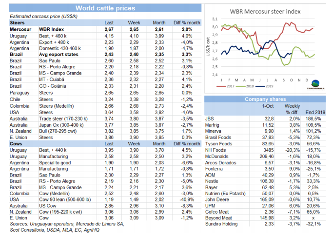 新廠被授權準入中國使南方共同市場對中國牛肉出口凈重每月至少增長4萬噸。中國授權準入17家巴西新廠,8家阿根廷新廠,1家烏拉圭新廠,現在主要的局限是冷凍能力。這也是之前為了在未來幾個月內增加對中國產量進行投資的原因。預計巴西對中國出口量將增加一倍,今年每月直接出口到中國約3萬噸,8月增長至3.7萬噸,對冷凍能力的投資完成后,每月出口將達到7萬噸。其中一部分來自水漂貨市場,另一部分來自目前輸出的其他目的地,如中東,智利。今年截至目前,阿根廷平均每月對中國出口2.9萬-3萬噸,新工廠被授權后可達4萬噸,也需要投資改善冷凍條件。烏拉圭工廠屬于中小型,考慮到其持股人是中國公司,也可以供一些量。2019年前八個月南方共同市場對中國平均每月出口約7.5萬噸,冷凍條件的投資一旦完成,加上準入的新工廠,每月出口量將攀升至11萬-12萬噸,占出口總量的55%-57%。