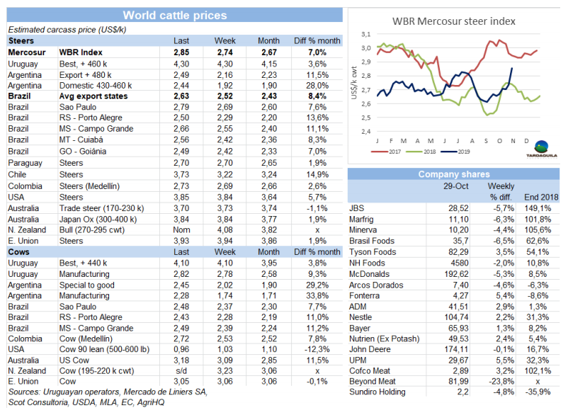 南方市場閹牛平均價格從20184月起達到最高水平。世界牛肉周報南方閹牛胴體價格增長了11美分,增長至2.85美元/公斤。上漲有多方面原因。最為顯著的是阿根廷價格的上漲,周日反對黨在大選中勝出時,報盤數量立刻達到最低,官方對貨幣兌換進行了嚴格控制。阿根廷出口閹牛價格增長了33美分,增長至2.49美元/公斤,包含進口稅。巴西育成公牛增長也很強勢,雷亞爾價格漲了2.1%,每15公斤牛肉價格增長了3雷亞爾。因此在巴西主要的出口州育成公牛平均價格本周增長11美分,增長至2.62美元/公斤。烏拉圭和巴拉圭的市場參考價本周保持不變,烏拉圭價格4.3美元/公斤,巴拉圭2.7美元/公斤。
