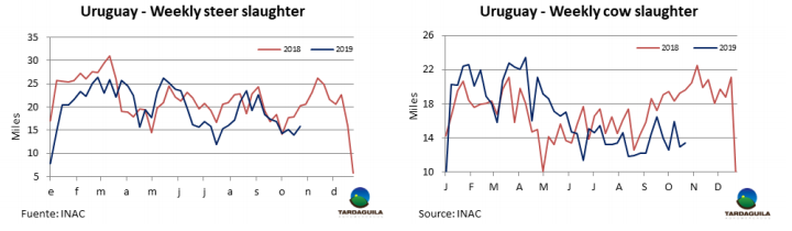 上周牛屠宰量輕度回漲。烏拉圭肉協報道。上周牛只屠宰量34563頭,比前一周增長1165頭,增長3.5%,比去年同期減少1.2萬頭,去年同期屠宰量4.6萬頭。春季還未完全到來,這為牛只育肥帶來困難。本周屠宰量增長主要來自閹牛,閹牛屠宰量15792頭。增長了13%,母牛屠宰量增長了500頭,增長至13404頭,幼母牛減少了1000頭,減少至4703頭。屠宰量活動最為活躍的廠是 Minerv-PUL3972頭),Marfrig-Tacuarembo3349頭),Las Piedras3246頭)。Marfrig四家工廠共屠宰11097頭牛,屠宰量比上周增加619頭。10月截至26日,牛只屠宰量130700頭,比去年同期減少4萬頭,與去年相比差距繼續拉大,這將是2013年以來10月份的最低水平。今年截至目前牛只屠宰量184萬頭,比去年減少9.1萬頭。