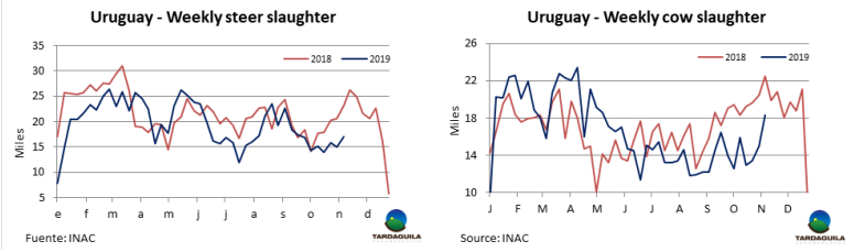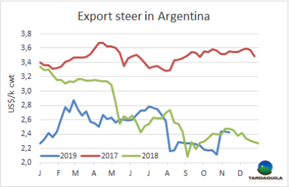 大選結果確定和貨幣兌換管控過后出口價格仍然堅挺。英國純種閹牛報價140-145比索/公斤,印度串種閹牛報價136-140比索/公斤,母牛價格上漲趨勢受中國需求影響,仍保持上漲趨勢:特種和良種母牛報價140-145比索/公斤,工業母牛報價125-130比索/公斤。