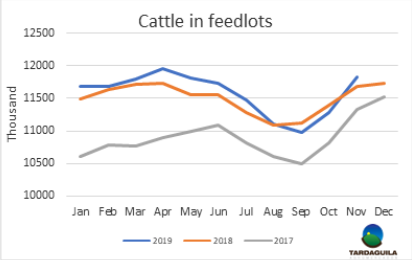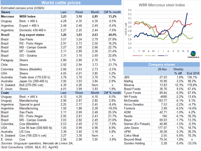 供應少量增加,工廠專注2020年歐洲481配額牛肉生產,活牛價格出現下行,期貨時間拉長。中國市場的價格下行也對價格有一定影響。特種草飼閹牛胴體價格4.25-4.3美元/公斤,一些工廠出價4.2美元/公斤,目前沒有買到。成年母牛售價4.1美元/公斤,小母牛4.2美元/公斤。市場上昨天成交的期貨14-15天。上周熱浪來襲,巴西南部的一些地區(qū)產生了降水稀少的擔憂,北部地區(qū)最近有100毫米降水,南部大多數地區(qū)幾乎沒有降水。近幾周屠宰場將集中481配額牛只的屠宰,草飼牛需求較低,工廠已經開始采購配額縮減后的牛只了。預計12月中旬市場價格將有下行趨勢。