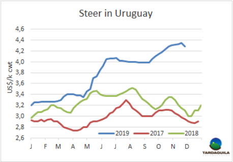 10月閹牛類產品價值1279美元/頭,比上月增長6美元,從7月的1210美元/頭連續(xù)四個月保持上漲趨勢。閹牛類產品價值是指一頭體重480公斤,產出率54%的英國純種閹牛或雜交閹牛產出的所有產品的平均價值的總和。烏拉圭肉協稱閹牛類產品價值的增長是因為閹牛部位肉出口價值的增長和國內市場胴體價格的上漲,部分抵消了牛副和鮮皮價格的下跌。換算成烏拉圭比索,2019年10月閹牛類價值和工廠閹牛采購價格達到自2008年11月11年以來最高。
