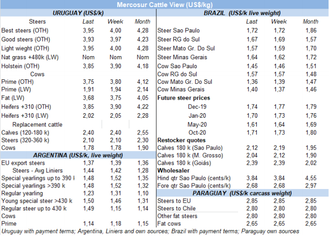 南方共同市場閹牛價格再次下跌3美分,胴體價格下降至3.07美元/公斤,四周以來連續(xù)下跌16美分。盡管巴西上周育成牛價格保持穩(wěn)定趨勢,在主要的出口州凈差額再次下跌2雷亞爾,下跌至184.5雷亞爾/15公斤。按美元算價格下跌4美分下跌至3.02美元/公斤。烏拉圭閹牛價格也在下跌,參考價格自9月上半月15周以來首次跌破4美元/公斤。巴拉圭和阿根廷參考價格的變化很小,巴拉圭育成牛胴體價格連續(xù)第五周保持2.8美元/公斤,阿根廷參考價下跌2美分,下跌至2.78美元/公斤。