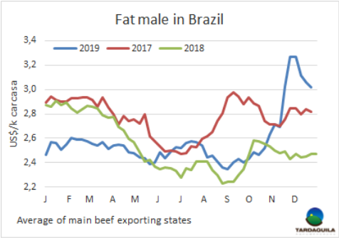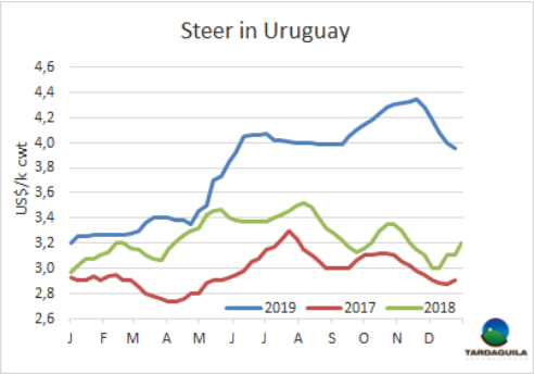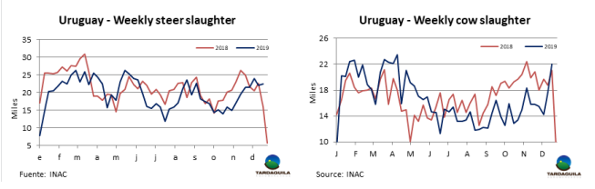 烏拉圭工廠也關注到中國市場的下行。巴西現(xiàn)在開始將部分出口供應轉(zhuǎn)向巴拉圭的關鍵市場,如智利和俄羅斯。智利圣地亞哥1月裝船的巴拉圭全牛20件套5300美元/噸,俄羅斯市場肩胛背肩上周從4100美元/噸下降到3800每元/噸。據(jù)一位業(yè)內(nèi)人士稱,后部位肉巴拉圭工廠售價不超過4300美元/噸,“競爭不容易,現(xiàn)在我們還要與活牛價格走低的巴西競爭。”