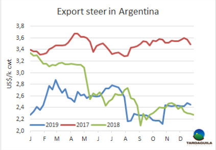 除了關于出口稅的許多未知因素外,還有一些人觀察到這種額外的稅率可能會引起該行業(yè)的自我凈化。Cofrigo經(jīng)理表示,出口稅的增加可能會使所謂的屠宰經(jīng)銷商的業(yè)務復雜化。“目前,經(jīng)銷商在利涅爾斯買牛(額外成本5%),在第三方工廠屠宰(250美元額外成本),在代宰工廠或另一個工廠加工(200美元額外成本),存儲在另一家工廠中(短途貨運要多付50美元),全部加上相應的增值稅,再加上沒有受過訓練的人員的低質(zhì)量低效率的作業(yè)(我估計至少損耗5%),總計約900美元。這將使出口業(yè)務很難進行,如果他們無法收回增值稅,那就更糟糕。我認為,這種價格變化的過程,將使許多沒有工廠、也沒有固定結(jié)構(gòu)、能源、勞動力等成本的局外人,以及許多沒有真正出口業(yè)務的“新”公司,重新思考自己的未來。出口商必須在每個階段都努力工作,保證盈利。”