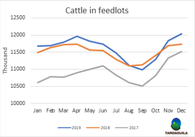 2019年12月1日,美國屠宰市場存欄能力1000頭及以上的飼育場牛只存欄總計約1200萬頭,比2018年12月1日增長2%。11月補欄209萬頭,比2018年增長5%,凈增203萬頭。11月出欄總量181萬頭,比2018年減少3%,11月掉頭數(shù)量6.5萬頭,比2018年減少了19%。