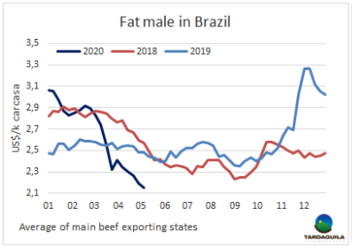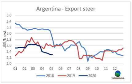 雖然在隔離令開始時,阿根廷國內市場的牛肉消費出現反彈,但隨著實行社會補貼,最初的熱情逐漸消退。一位市場專家指出,這些天來,恐慌累積導致許多產品的需求下降,原因是家庭預算問題,信用卡的使用時間縮短到月底。牛肉是受到影響的一種商品,價格與國外市場相比很低,本地也沒有其他的食物的競爭,這反映出供應多而價格下跌。此外閹牛的需求端出現問題,國內需求僅能消費牛肉產量的四分之三。
