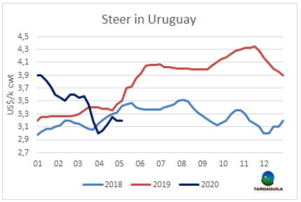 由于牛只供應的短缺和新冠肺炎影響下屠宰活動減少,4月牛只屠宰量同比減少了35%,至137478頭,較上年減少7.3萬頭。盡管每月最后兩周屠宰量會增長,但與2019年第四個月的差距是今年以來最大的。截止5月3日的一周,工廠收了36122頭牛進行屠宰,周屠宰量較上周減少了10%,減少約4000頭,較去年同一周減少了15%。閹牛屠宰量降幅最低,降低了7.2%,至15892頭,母牛屠宰量降低了11.7%,至15283頭,小母牛屠宰量降低了12.7%,至4141頭。屠宰量最大的工廠是 Marfrig-Tacuarembó (3561頭),Las piedras(3550頭), Carrasco (3078頭).Marfrig四家工廠屠宰總量10851頭,美麗華兩家工廠屠宰總量4746頭。今年前四個月烏拉圭牛只屠宰總量601864頭,較2019年同時期減少了23.6萬頭,減少了28.2%。