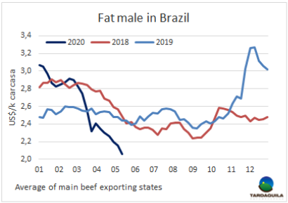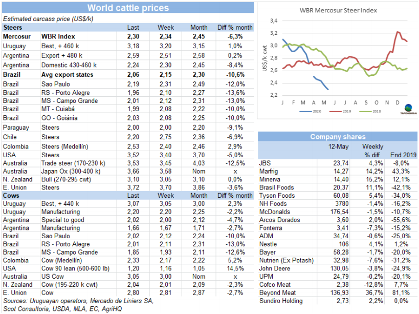 與出口到國內市場的工廠相比,直接出口到中國市場的肉類加工廠要多花10雷亞爾采購出口至中國的適齡牛(30個月齡以下),這反映了出口相對于國內需求的卓越競爭力。這主要是由于雷亞爾疲軟,昨天雷亞爾兌美元匯率為5.87。在上周日母親節(通常在每個月的月初)出現額外需求之后,巴西國內市場對牛肉興趣不大,新冠疫情危機中,消費者趨向于選擇更便宜的蛋白質。圣保羅育成牛參考價193雷亞爾/15公斤,較上周下跌1美分。預定時間拉長至9天左右,其他州,例如米納斯吉拉斯,預定時間拉長至11天。不同地區價格走勢不同,戈亞尼亞州價格有回漲,參考價在178.5雷亞爾/15公斤。