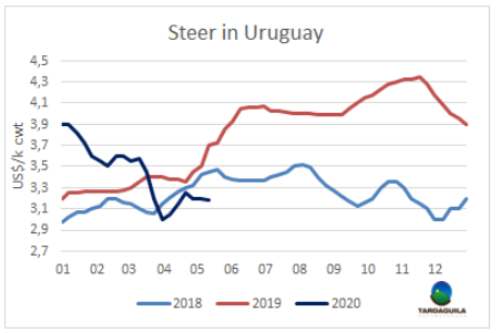 上周牛只屠宰量再次增長,保持從四月前半月開始逐漸恢復的趨勢。截止5月9日的一周,牛只屠宰量42390頭,周屠宰量較前一周增長了6300頭,包含5月1日的假期,較截止4月25日的一周屠宰量增長2000頭。上周屠宰量的主要增長的是閹牛,因為為481配額準備的牛只已經運抵工廠,但是由于歐洲市場不樂觀,將出口至不同的市場。閹牛屠宰量19942頭,較前一周增長25%,增長了4000頭。母牛屠宰量16919頭,小母牛屠宰量4564頭,均較前一周增長超過10%。屠宰量最大的工廠是 Marfrig-Tacuarembó (4023頭),NH-BPU(3765頭),Athena-Carrasco (3759頭)。Marfrig上周屠宰量11918頭,較前一周增長約1000頭,美麗華兩家工廠屠宰總量7501頭,達到兩年前屠宰量水平。