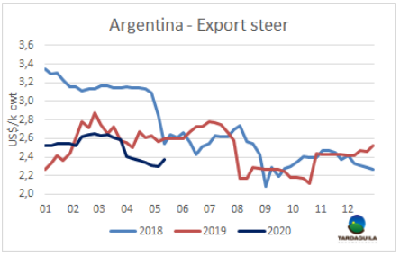 2020年開端南美國家屠宰量下降,但這并不意味著出口量減少。相反,受新冠肺炎疫情影響,相對于國內市場的疲軟,出口活動獲得了有競爭力的收益,出口量保持堅挺。今年前四個月,南方共同市場牛只屠宰量約1270萬頭,較2019年同期減少90萬頭,減少6.6%。烏拉圭牛屠宰量減少最嚴重,減少了23.1萬頭,約28%。屠宰量占比最大的是巴西,巴西經過認證的肉類工廠牛只屠宰量706萬頭,較2019年同期減少95.5萬頭,約12%。阿根廷和巴拉圭屠宰量增長部分抵消屠宰量的下降。在為遏制新冠病毒擴散采取的措施給給國際貿易帶來了極大的復雜性的情況下,產量的下降并沒有阻止出口保持堅挺。1-4月,南方共同市場牛肉出口量79萬噸,高出2019年同期出口量(77萬噸)。出口相對國內市場在盈利方面的強競爭力成為巴西出口趨勢得以保持的主要原因。巴西肉類加工廠以雷亞爾買牛,那些做國內市場的以雷亞爾賣牛肉,以滿足巴西國內消費者的需求。相反,出口工廠以美元賣牛肉,美元的價值一天比一天高。自年初以來,巴西貨幣的貶值幅度一直在40%上下波動。因此,盡管牛肉產量下降,巴西出口商海外銷售發運量46.7萬噸,較2019年1-4月增長5%。阿根廷情況一樣,盡管出口商必須以官方匯率(較平行市場低很多)將收到的美元兌換成比索,并且付9%的出口稅,阿根廷1-4月出口量小幅增長,上漲了10%,阿根廷1-4月屠宰量上漲了6%。烏拉圭情況類似,今年截至目前,出口量的降幅小于屠宰量的降幅,分別為(20%和28%),屠宰量的減少被進口量的增長抵消。巴拉圭出口量和屠宰量的漲幅相當,3%-4%??傊?,南美地區作為世界最大的牛肉供應地區,保持堅挺的銷量,盡管新冠肺炎疫情給需求端帶來困境,動物蛋白需求旺盛,尤其是亞洲大陸,更精確說是中國。