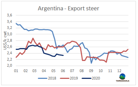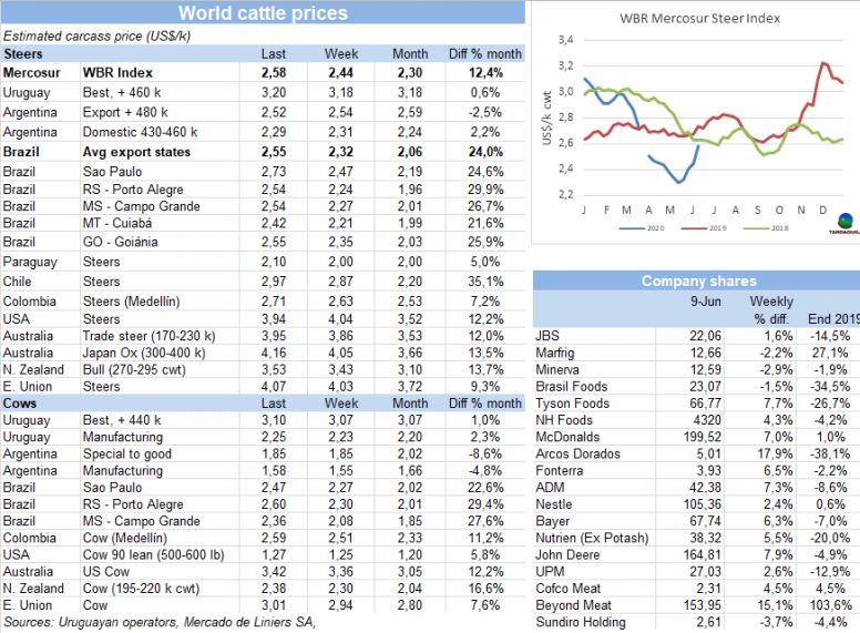本周南方共同市場閹牛價格急劇上漲,達(dá)到三月中旬疫情剛剛開始在南美地區(qū)蔓延時的價格水平。本周南方共同市場閹牛價格上漲14美分,上漲至2.58美元/公斤。巴西活牛價格上漲是主導(dǎo)因素,但巴西不是牛價上漲唯一的原因。本周雷亞爾增值6.7%,較5月中增值17%。經(jīng)濟(jì)危機(jī)期間通貨膨脹急劇下降,給貨幣當(dāng)局大幅降低市場基準(zhǔn)利率的空間。巴西主要出口州育成牛價格上漲了5.3雷亞爾/15公斤,上漲至187.1雷亞爾/15公斤,達(dá)3月末以來最高。巴拉圭牛價在連續(xù)5周穩(wěn)定之后也有上漲,烏拉圭市場堅挺,只有阿根廷牛價受匯率變化的影響有所下跌,但出口閹牛價格穩(wěn)定在160比索/公斤。