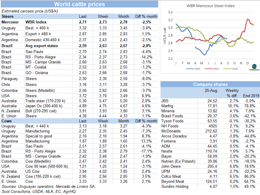 本周巴西雷亞爾貶值2.6%,因此盡管巴西待宰牛價格保持堅挺,甚至上漲,美金育成牛牛價仍下跌4美分,下跌至2.59美元/公斤。這是本周南方共同市場閹牛價格指數下跌2美分至2.71美元/公斤的主要原因。其他地區牛價保持穩定,阿根廷有輕微漲幅,烏拉圭牛價下跌。