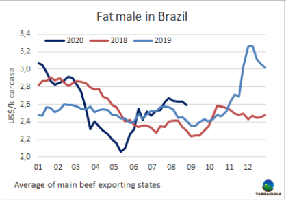 下周猶太屠宰季即將結束。猶太屠宰季始于6月,在阿根廷外交部和以色列大使館的共同努力下,牛肉加工機構設法將猶太潔食的工作人員從以色列包機帶回。屠宰隊將在猶太新年結束工作,目前還不清楚他們什么時候能回來。因此,牛犢的貿易在一個月到一個半月之內將退出游戲。這使工廠面臨的情況更加復雜,閹牛價格上漲,國內市場低迷,希爾頓配額價格由于新冠疫情的再次出現和需求的疲軟而下跌,美國配額用盡,中國市場僅有貨值低的部位需求且價格上漲緩慢。