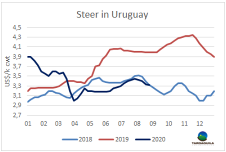 截止8月20日的一周,在屠宰量和各牛種的分布上屠宰量水平與前一周相當。烏拉圭肉協報告,上周合規屠宰場活牛屠宰量38527頭,較上周增長了65頭,同比去年同期的屠宰量4.3萬頭下降了10%。屠宰場繼續481配額的屠宰,這也反應了屠宰的構成,與上周相同,其中閹牛屠宰量21478頭,占55.7%,小母牛屠宰量7335頭,占19%,母牛屠宰量9262頭,占24%。屠宰量最高的工廠是Marfrig-Tacuarembo(4596頭),Las Piedras(4339頭),NH-BPU(3976頭)。Marfrig三家工廠屠宰總量11023頭,較前一周增長了10874頭。八月截止22日屠宰量114992頭,同比下降了9.3%,八月屠宰量預計在15萬頭多一些,與2019年八月17.8萬頭相差較遠。