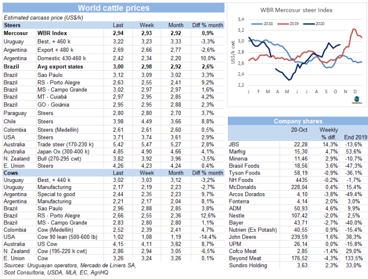 上周活牛屠宰量急劇上漲,供需均有增長。烏拉圭肉協報道,截止1017日牛屠宰量47577頭,較上周上漲了7000頭,增長了18%,較去年同期增長了1.4萬頭,這更加鞏固了10月屠宰量將達到頂峰,同比去年有所增長的說法。這是今年第二個月屠宰量高于去年同月。本周所以種類的牛屠宰量均有增長,增幅最大的是閹牛,增加了20.4%,至21311頭,母牛屠宰量增長了16.6%,增長至19592頭,小母牛屠宰量增長了10.7%,增長至5623頭。上周所有工廠屠宰活動活躍,屠宰量最高的工廠是Athena-Carrasco(4515)Marfrig-Tacuarembo4233頭)和NH-BPU4091頭)。Marfrig四家工廠屠宰總量13983頭,達五今年截至目前來最大。美麗華兩家共廠屠宰量8055頭,達六月第一周以來最大。十月截至目前牛屠宰量104953頭,較2019年同期增加了1.7萬頭,增長了19.1%