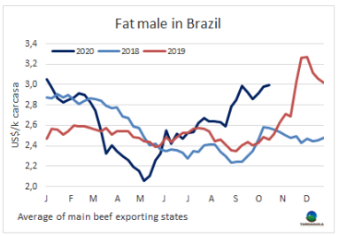 屠宰工廠為出口中國準備的牛的活牛支付高價的階段已經基本過去了,能滿足春節需求的船期大多數都在十一月中旬,很明顯很多出口商已經完成銷售。圣保羅育成牛成交價261-265雷亞爾/15公斤,較上周上漲了3雷亞爾/15公斤。本周初市場較為平靜,可能是由于預期國內需求將在本月下半月趨于平靜。盡管大部分地區牛家有所上漲,但米內羅三角和戈亞尼亞等地區的牛價上周沒有發生變化。