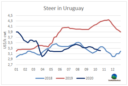 在過去的一年里,由于激進的需求推動牛價上漲,因此,通過在飼養方面的更大投資,加速了動物屠宰速度,待宰閹牛牛齡大幅下降。根據國家肉類研究所(INAC)的數據,在截止8月的12個月中,合規屠宰場活牛屠宰量91.5萬頭。較上個12個月相比(截至20198),大幅下降,減少了12.5萬頭,降幅為12%。但并非所有類別都出現了下降,那6顆齒和滿齒的牛的屠宰量下跌,被2-4顆齒的牛屠宰量增長所抵消。今年截至八月2-4顆齒閹牛屠宰量44.3萬頭,較前12個月增長了10%6顆齒活牛屠宰量下降了26%,下降至15.5萬頭。滿齒活牛屠宰量下降了35%,下降至22.8萬頭。因此,最低牛齡的類別占屠宰總量的48.4%。造成這一趨勢的原因毫無疑問與補欄和育肥進程中的投資加大有關。這并不是偶然的,因為這個國家有最大的永久牧場和每年的飼料作物。根據畜牧部的數據,共有180萬公頃的天然牧場土地,至少是本世紀迄今為止最大面積。與此同時,飼養場的投資得以維持。盡管全球屠宰量有所減少,但今年到目前為止,出欄總數與去年非常相近。絕大多數是2-4顆齒的牛和小母牛。
