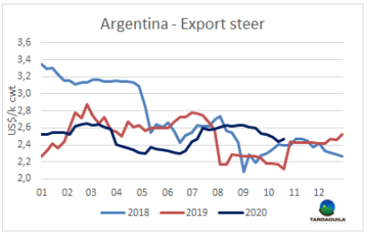 盡管歐洲市場由于疫情爆發價格下跌,最好的閹牛價格回到了兩周前的水平。最好的英國純種閹牛目前成交在188-193比索/公斤。印度串種閹牛185-190美元/噸。特優母牛價格與上周持平,170-178比索。工業母牛價格繼上周上漲了14比索后又上漲了5比索,目前價格在160-165比索。