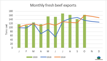 澳大利亞長期的干旱和季節(jié)性條件的改善導(dǎo)致活牛供應(yīng)緊張,因為生產(chǎn)者繼續(xù)重建牛群。因此,到印度尼西亞出口的體重較小的閹牛價格在2020年達(dá)歷史最高,9月的平均價格比去年同期高出13%。由于供應(yīng)受限和價格高位,出口量遠(yuǎn)低于一年前的水平。9月活牛出口量達(dá)7.8萬頭,較去年同月回落28%。今年1-9月的出口量較2019年水平回落了12%。MLA的養(yǎng)牛業(yè)預(yù)測 10月更新表明,2020年活牛出口預(yù)計將下降16%,主要是由于澳大利亞北部供應(yīng)水平的下降。