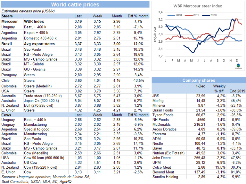 巴西匯率變化和阿根廷育成牛價格是本周主南美地區閹牛價格上漲的主要原因。巴西育成牛平均價格連續兩周下跌,本周下跌了1.7%至264.8雷亞爾/15公斤,但雷亞爾升值2.47%,主要因為美元價值下降,因此,本周育成牛美元價格上漲了4美分,至3.37美元/公斤。阿根廷牛價的急劇上漲仍在持續,本周上漲了13美分至3.05美元/分,烏拉圭牛價也有上漲,扭轉了連續十周的下跌趨勢,特種閹牛成交價2.88美元/公斤。巴拉圭牛價下跌,本周下跌了15美分,下跌至2.8美元/公斤,南方共同市場閹牛價格指數本周上漲了4美分,至3.19美元/公斤。