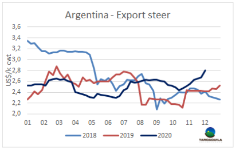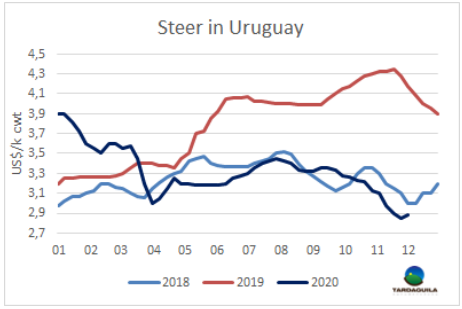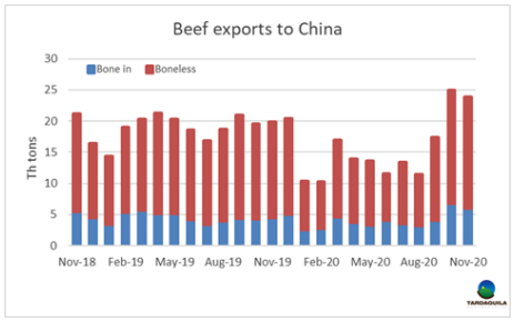 根據海關統計數據,11月烏拉圭牛肉出口總量34522噸,平均離岸價5123美元/噸。盡管接下來幾周數據可能會有下行調整,目前這是2006年五月至今14年以來最大月出口量。2006年屠宰量創最高記錄。中國在出口目的地中占據主導地位,烏拉圭對中國出口去骨牛肉17124噸,出口帶骨牛肉6046噸,對美國和烏拉圭的牛肉出口量分別為2503噸和1334噸,對以色列牛肉出口量1049噸。由于對中國的平均出口價格上漲,以及對歐盟的冷凍出口增加,平均出口價格也有所提高,因為2021年1-3月季度的481配額的發貨已經開始。烏拉圭到中國平均出口價格4244美元/噸,自六月以來保持連續的上漲趨勢,六月平均出口價3695美元/噸。本月價格漲幅最大的是帶骨部位肉,平均價格3505美元/噸,較上月上漲了4.2%,較年中上漲了25%。