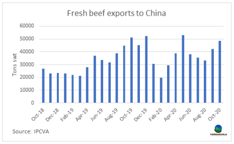 10月冰鮮和冷凍牛肉以及牛肉加工產品出口總量達59319噸,出口額達2.396億美元。這一數字反映出出口量同比下降了9.6%,出口額下降了34.3%,不包含牛副。差異主要是由于平均價格的下跌,總體平均價格較2019年10月下跌了27.3%,較2020年9月下跌了4.2%。冰鮮牛肉平均價格7000美元/噸,冷凍牛肉平均價格3900美元/噸,較2019年同期分別下降了18.1%和25.4%。