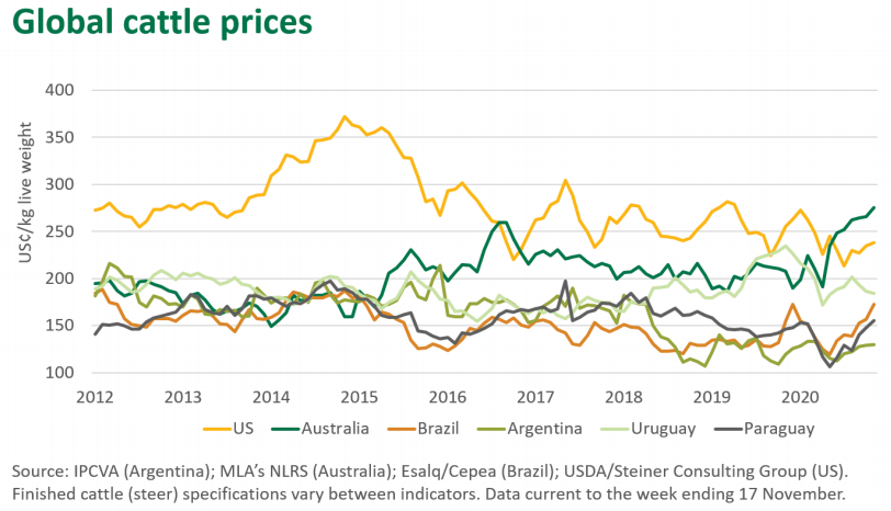 全球牛價漲跌不一,受各種供求因素在全年影響價格的劇烈波動。目前,美國新冠病例數量的增加、南美的干旱情況以及澳大利亞各地季節性情況的變化仍是影響牛價的關鍵因素。今年早些時候,降雨促進了行情拐點的到來,導致澳大利亞的牛價飆升,因為生產者希望在長時間的大量成交后補充供應水平。隨著對牛的需求升溫,澳大利亞各地的后備牛的價格高于種牛和待宰牛,達到創紀錄水平。通常情況下,澳大利亞的牛價一般于與烏拉圭保持一致,低于美國的水平。然而,MLA表示,自6月以來,澳大利亞牛價一直處于世界最高水平。