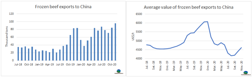 10月冰鮮和冷凍牛肉以及牛肉加工產(chǎn)品出口總量達(dá)59319噸,出口額達(dá)2.396億美元。這一數(shù)字反映出出口量同比下降了9.6%,出口額下降了34.3%,不包含牛副。差異主要是由于平均價(jià)格的下跌,總體平均價(jià)格較2019年10月下跌了27.3%,較2020年9月下跌了4.2%。冰鮮牛肉平均價(jià)格7000美元/噸,冷凍牛肉平均價(jià)格3900美元/噸,較2019年同期分別下降了18.1%和25.4%。