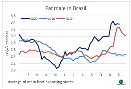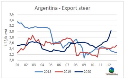 出口牛的價(jià)格在過去兩個(gè)月急劇上漲。漲勢最兇的是閹牛,尤其是英國純種閹牛,10月第一周和12月第一周之間增長了31.6%。同期,印度串種閹牛價(jià)格上漲了27.7%。特優(yōu)母牛價(jià)格過去兩個(gè)月累計(jì)增長23.6%,而主要銷往中國市場的工業(yè)母牛增長了25.0%。兩個(gè)月前,市場分析師Victor Tonelli就預(yù)測到了牛價(jià)上漲,他指出,過冬犢牛的價(jià)格和飼養(yǎng)成本的比率比從飼養(yǎng)場出欄的活牛價(jià)格高出20%/25%,這使得養(yǎng)殖業(yè)無法生存,并導(dǎo)致了飼養(yǎng)場空置。