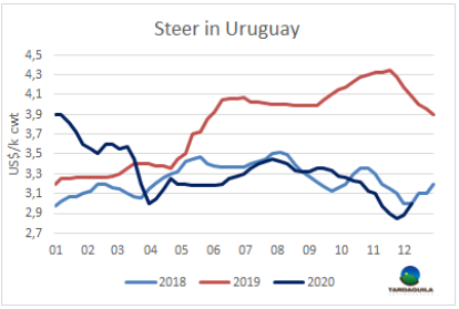 牛屠宰量連續(xù)第二周下降,最近四周牛屠宰量在5萬頭以下。烏拉圭肉協(xié)報(bào)道,截止12月5日合規(guī)屠宰場活牛屠宰量達(dá)49055頭,較上周下降了2672頭,下降了2.5%,但較去年同期增加了4%。大部分481配額屠宰活動(dòng)完成,閹牛屠宰量下降明顯,本周閹牛屠宰量僅23939頭,較上周增長了5300頭,母牛屠宰量增長了2700頭,增長至18724頭。本周屠宰量最高的工廠是Marfrig-Tacuarembo(4846頭),Athena-Pulsa(4508頭)和Athena-Carrasco(4089頭)。Marfrig四家工廠屠宰總量略有下降,14382頭,美麗華兩家共廠屠宰量8597頭,比上周多853頭。11月牛屠宰量已達(dá)212062頭,較2019年同期增加了22570頭,連續(xù)第二個(gè)月牛屠宰量高于去年同月。