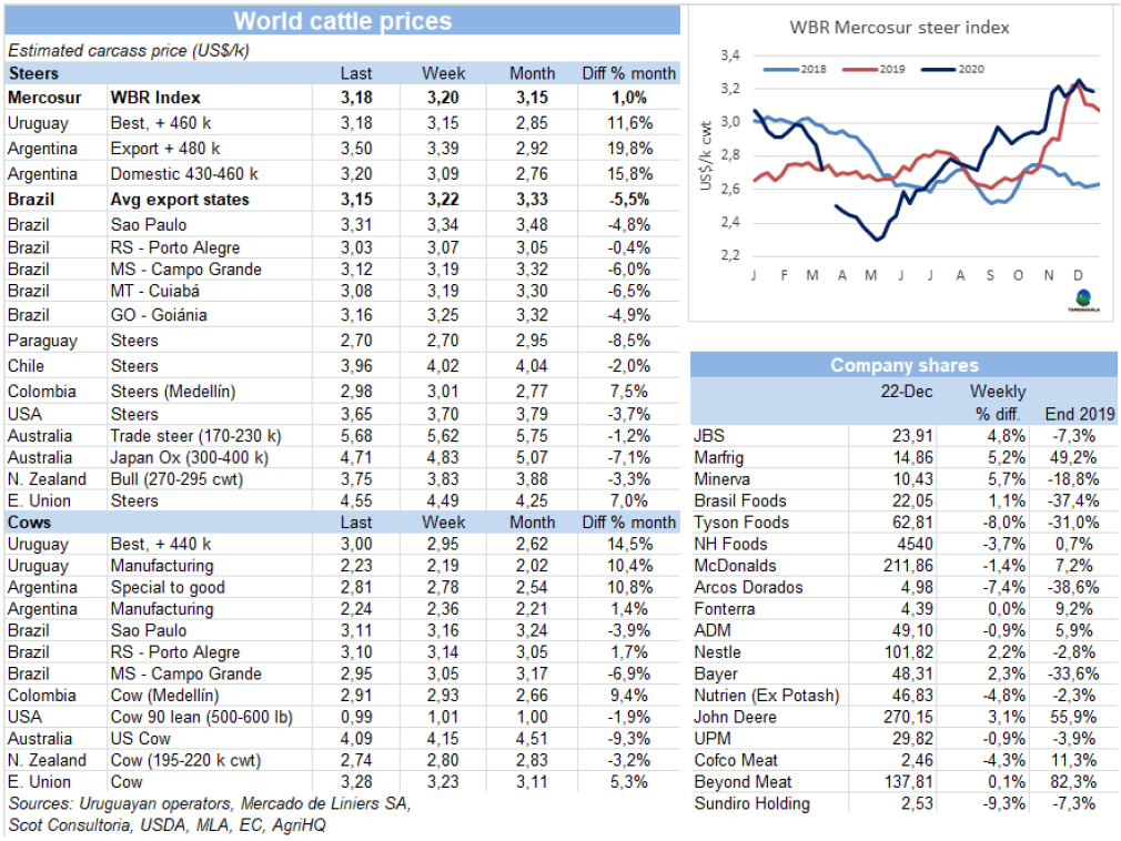 上周牛屠宰量再度下降,近四周內(nèi)屠宰量累計下降了10000頭。烏拉圭肉協(xié)報告,截止12月19日合規(guī)屠宰場牛屠宰量達44805頭,較上周下降了3577頭,較去年同期增長了7000頭。母牛屠宰量有下跌,母牛和小母牛屠宰量均有15%的下跌,本周分別下跌至16375頭和6268頭。相反,閹牛屠宰量增加了4%,至21328頭。本周屠宰量最高的工廠是Athena-Pulsa(5148頭),Marfrig-Tacuarembo(4870頭)和LasPiedras(4139頭)。Marfrig四家工廠屠宰量14319頭,美麗華兩家廠屠宰量8616頭,均保持上周水平。12月截止19日,牛屠宰量133053頭,與2019年屠宰量水平相當。