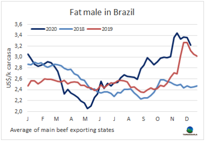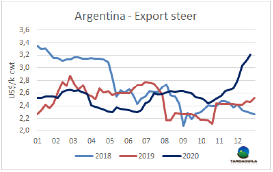在活牛價格飆高、出口市場價格低迷的背景下,至少有六家工廠決定暫停圣誕節(jié)到1月4日的屠宰活動,這些工廠包括Swift,Gorina,ArreBeef,SanJorge,Frimsa和Rafaela。暫停屠宰活動有助于維持牛價,對閹牛需求的下降將有助于價格下降,通常也會在1月份發(fā)生,因為生產(chǎn)者的供應量將比12月份增多。