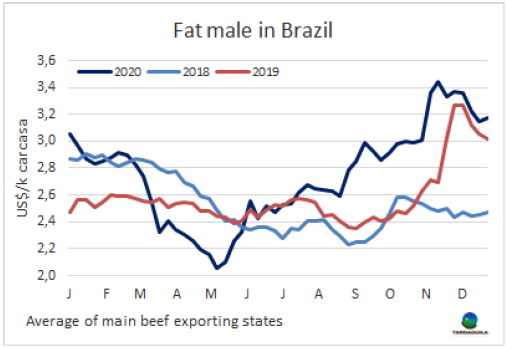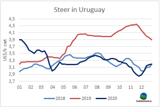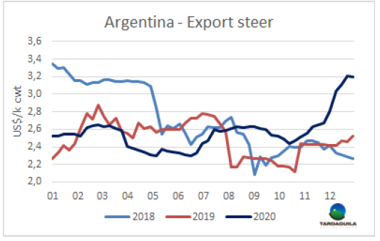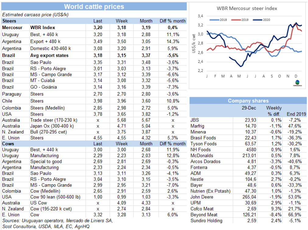 本周南方共同市場閹牛價格以上漲結束了2020年的走勢。本周價格上漲了2美分,上漲至3.28美元/公斤,較本年度價格最高點僅相差5美分(12月初時),較5月南美地區疫情最嚴重時牛價最低點高90美分(39%)。本周南美牛價指數上漲主要由于巴西和烏拉圭牛價上漲,本周巴西育成牛價格上漲了4雷亞爾,上漲至248雷亞爾/15公斤,結束了前幾周的下行趨勢,由于雷亞爾貶值,美元價格漲幅較小,美元牛價上漲了3美分至3.18美元/公斤。烏拉圭由于供應減少,特種閹牛價格上漲了2 美分,上漲至3.2美元/公斤。阿根廷方面前幾周市場堅挺,本周趨于平穩,由于阿根廷比索貶值蓋過了本地牛價的上漲,出口閹牛價格下跌了1美分至3.49美元/公斤。巴拉圭市場活牛價格連續第三周保持平穩,保持2.7美元/公斤。