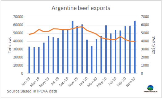 根據阿根廷牛肉推廣局發布的報告,11月冰鮮牛肉、冷凍牛肉及其加工產品出口量總計65757噸,達十年以來最大,出口額達2.616億美元。這些數字意味著出口量與2019年11月相比增長11.4%,出口額下降了22.6%。該差異產生的原因是11月平均出口價格較去年同期降低了30.5%,11月冰鮮去骨牛肉平均出口價格達近6250美元/噸。冷凍去骨牛肉平均價格4000美元/噸,同比分別下跌了22.7%和27.4%。平均出口價值自2009年以來首次降至每噸4000美元以下,達整個南美地區最低。市場分析師Ignacio Iriarte告訴記者,以同等胴體重量計算的月出口量和年出口量記錄是90多年來最高的。