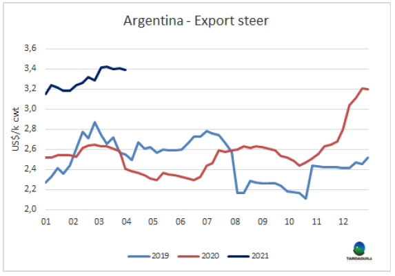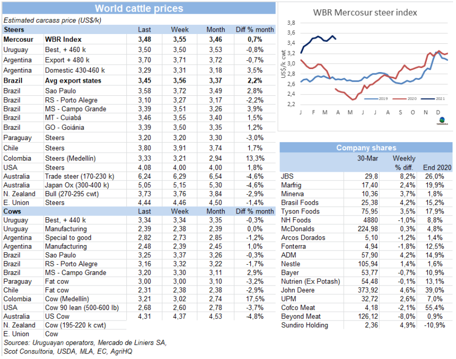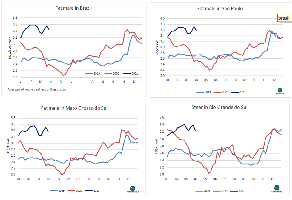 對于疫情發展的擔憂和巴西內閣部長的換屆給巴西貨幣價值造成影響。巴西雷亞爾較美元貶值了4.4%。因此盡管巴西按雷亞爾計的育肥牛價格繼續上漲,轉換成美元價格后本周下跌了11美分至3.45美元/公斤。本周其他地區牛價保持不變。南方共同市場牛價下降了7美分至3.48美元/公斤。
