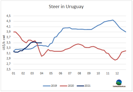 育成閹牛的價格下行持續時間很短,最近降雨雖然不大,但供應端不急出售。參考價與上周相同,特種閹牛3.5美元/公斤,重型母牛3.3美元/公斤,45天付款包含運費。對母牛的采購興趣要強于閹牛,因為母牛的生產主要是面向中國市場,而歐洲市場非常低迷,猶太屠宰團隊也沒有開工。期貨的預定時間在一周左右。烏拉圭新冠病例不斷增長迫使工廠不得不充分利用工作日全面生產,因為一旦有工廠發現新冠病例工廠將停工數日。由于目前的供應相對于需求仍處于短缺狀況,預計復活節周之后市場將恢復堅挺。