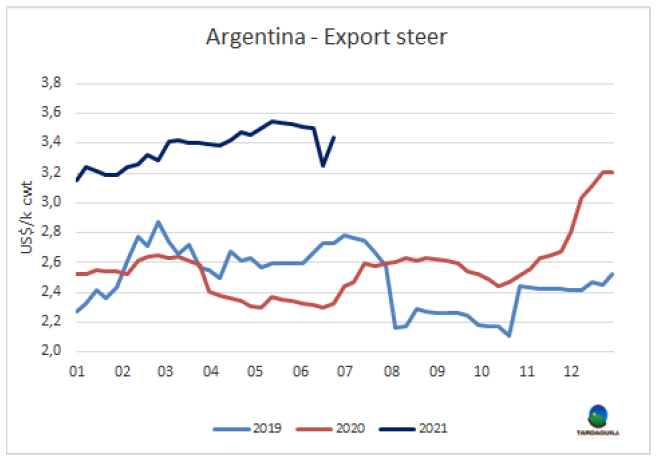 在巴西貨幣政策委員會(huì)上周公布會(huì)議記錄后,美元匯率突破了5雷亞爾的下限,并承認(rèn)基準(zhǔn)利率可能會(huì)以更高的速度上調(diào)。盡管巴西育肥牛的雷亞爾價(jià)格較上周幾乎保持不變,雷亞爾匯率上升1.5%使美元牛價(jià)增長(zhǎng)了7美分至4.08美元/公斤,達(dá)2011年以來(lái)最高。阿根廷方面,英國(guó)純種閹牛上周價(jià)格反彈,美元價(jià)格上臟19美分至3.74美元/公斤,包含出口稅。巴拉圭待宰牛價(jià)格上漲了5美分至3.45美元/公斤。烏拉圭市場(chǎng)堅(jiān)挺,參考價(jià)格保持不變,特種閹牛4-4.05美元/公斤。南方工體歐諾個(gè)市場(chǎng)閹牛價(jià)格指數(shù)較上周增長(zhǎng)了9美分至3.95美元/公斤。