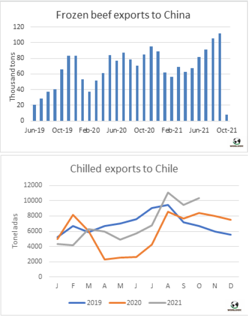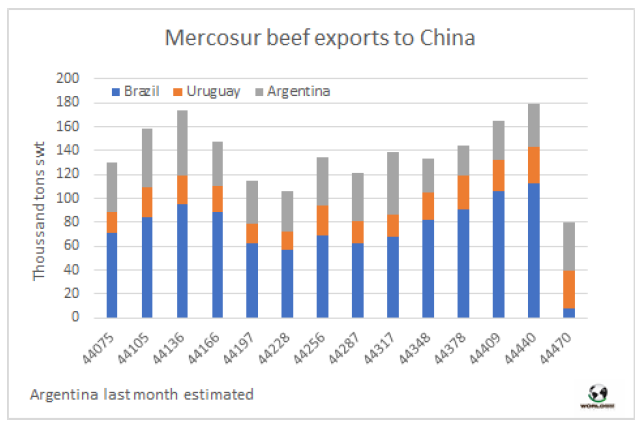 巴西牛肉退出中國市場造成南美市場對中國牛肉出口量下降了約10萬噸,可能從9月的18萬噸將下降至10月的8萬噸。巴西的出口量減少了10萬多噸,僅為8000噸,而烏拉圭的出口量仍保持在9月的歷史高位,約3.15萬噸。盡管阿根廷的數據尚未公布,但預計隨著工業母牛出口限制的放松,預計出口量將增至約4萬噸。