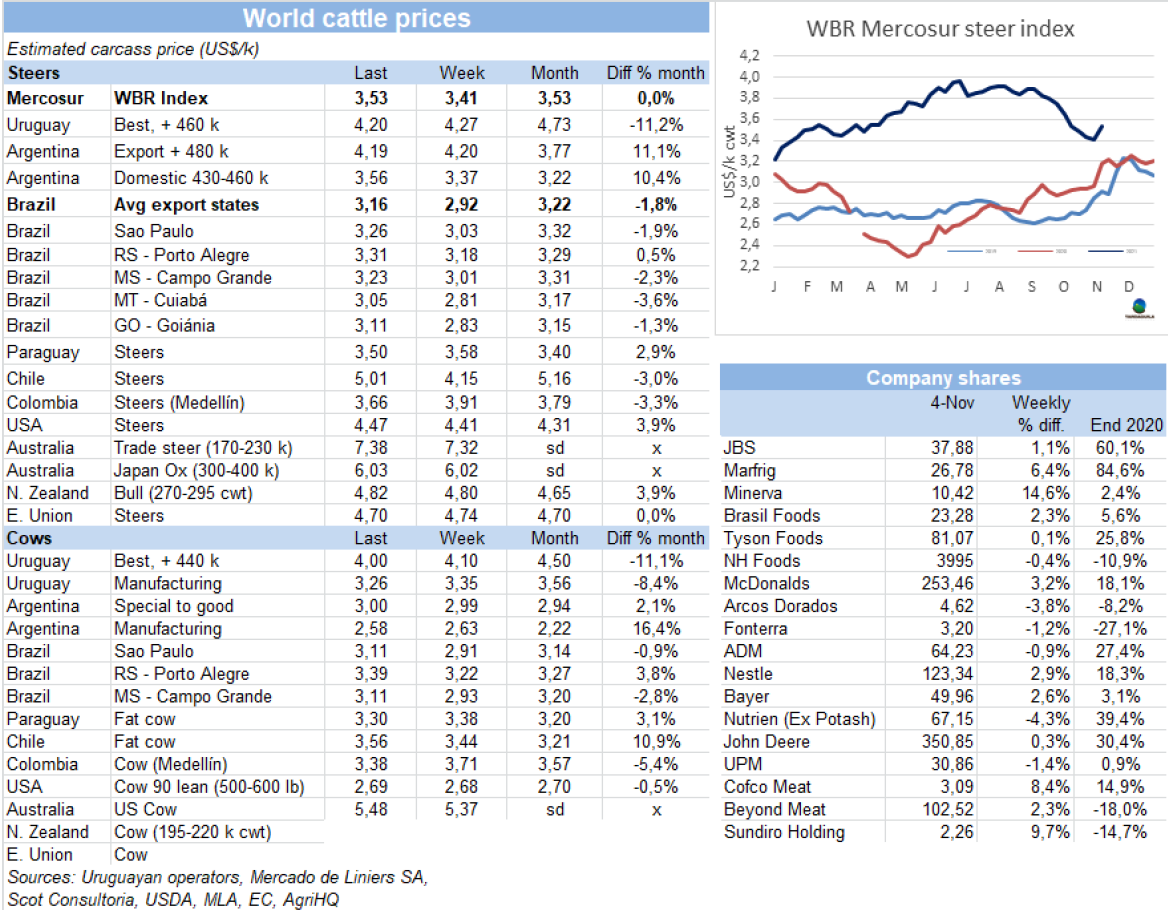 中國讓巴西的農場主和肉類加工廠焦慮不安,但Minerva Foods的季度業績還是創新紀錄。由Vilela de Queiroz家族領導的公司在中國對巴西牛肉禁令的大背景下,利潤率不降反漲,預計將獲得2億雷亞爾的股息,到2021年,股東的回報率將達到12%。美麗華第三季度凈收入為73億雷亞爾,受牛肉價格上漲,尤其是國外市場牛肉價格上漲的推動,同比增長43.4%。Ebitda增長17%,達6.48億雷亞爾,創新紀錄。季度利潤達7240萬雷亞爾,同比增長24%。“盡管9月中國市場關閉,但我們的經營業績非常好。如果保持7月和8月的出口節奏,我們本可以取得出色的業績。Valor報告稱,截至10月,該公司已設法恢復在巴西的利潤率,這得益于畜牧價格下跌和牛肉價格持續上漲。