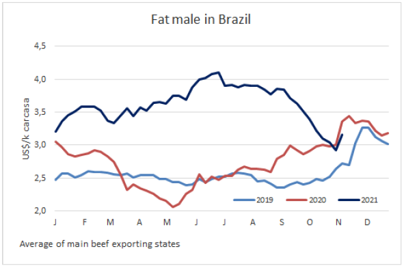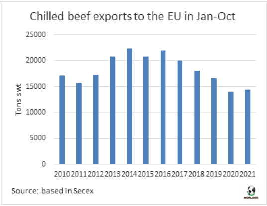 巴西對歐盟冰鮮牛肉出口量與2020年相當,處于較低水平