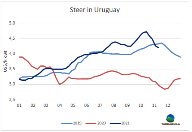 烏拉圭育肥牛市場受工會活動影響中斷,周一至周二,活牛采購商和中間機構重新制定周一到周二本應屠宰的牛的數量計劃,因此強勢的價格上漲被打斷。供應端在上周的降雨之前就受到限制。市場參考價保持上周周中水平,閹牛成交價4.15-4.2美元/噸,母牛成交價3.9-4美元/噸,45天付款。預計工會問題得到解決后,市場將在目前的價格水平形成大規模成交。