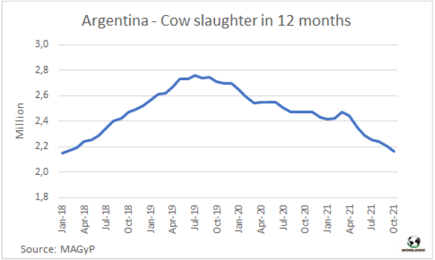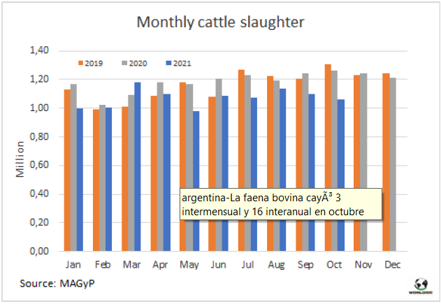 10月牛屠宰量106萬頭,是今年屠宰量最低的月份之一,僅超過了1月、2月和5月的屠宰量,1月和2月是夏季月份,5月出口暫停,禁止出口,農民為了抗議而停止銷售活牛。10月屠宰量較上月下降了3.2%,與2020年同期相比下降了15.7%。在2019年和2020年,10月都是一年中最繁忙的月份。截至2021年10月,阿根廷共屠宰了1070萬頭牛,比2020年同期減少9%。