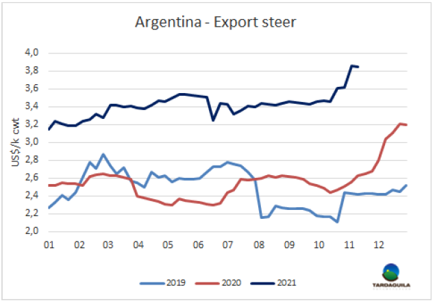 自6月份以來,牛屠宰量一直在下降。分析師認為,這種下降很大程度上與育肥場正在經歷的困難有關,育肥場面臨高昂的投入成本,而這些成本無法向牛價轉化?!跋鄬Χ?,11月和12月的屠宰量將會下降更多,這兩個月通常是屠宰活動活躍的月份。目前育肥的最后一個階段還沒有完成,但我們看到盈利能力下降,我們意識到,牛被宰殺用來消費銷售價值幾乎損失了15%,大約每頭1萬比索。我們11月的待宰牛供應會比較少,12月的供應更緊缺,更不用說1月、2月和3月了,”AgroVa電臺節目的專家表示。